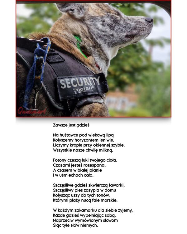 Na huśtawce pod wiekową lipą Kołyszemy horyzontem leniwie. Liczymy krople przy okiennej szybie. Wszystkie nasze chwile milkną. Fotony czeszą łuki twojego ciała. Czasami jesteś rozespana, A czasem w białej pianie I w uśmiechach cała. Szczęśliwe gdzieś skwierczą faworki, Szczęśliwy pies zasypia w domu Kołysząc uszy do tych tonów, Którymi plaży nucą fale morskie. W każdym zakamarku dla siebie żyjemy, Każde gdzieś wypełniając sobą. Naprzeciw wymówionym słowom Śląc tyle słów niemych.