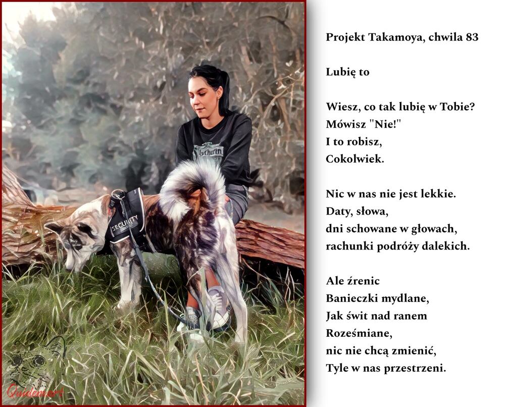 Projekt Takamoya, chwila 83 Wiesz, co tak lubię w Tobie? Mówisz "Nie!" I to robisz, Cokolwiek. Nic w nas nie jest lekkie. Daty, słowa, dni schowane w głowach, rachunki podróży dalekich. Ale źrenic Banieczki mydlane, Jak świt nad ranem Roześmiane, nic nie chcą zmienić, Tyle w nas przestrzeni.