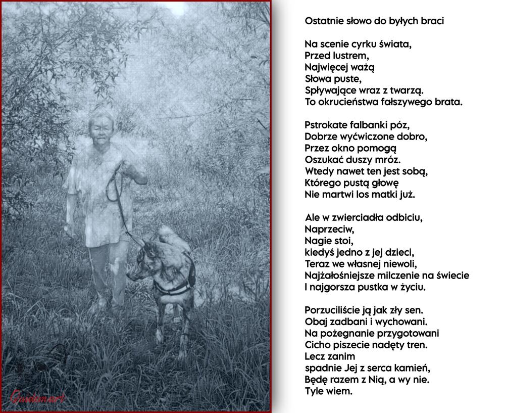 Na scenie cyrku świata, Przed lustrem, Najwięcej ważą Słowa puste, Spływające wraz z twarzą. To okrucieństwa fałszywego brata. Pstrokate falbanki póz, Dobrze wyćwiczone dobro, Przez okno pomogą Oszukać duszy mróz. Wtedy nawet ten jest sobą, Którego pustą głowę Nie martwi los matki już. Ale w zwierciadła odbiciu, Naprzeciw, Nagie stoi, kiedyś jedno z jej dzieci, Teraz we własnej niewoli, Najżałośniejsze milczenie na świecie I najgorsza pustka w życiu. Porzuciliście ją jak zły sen. Obaj zadbani i wychowani. Na pożegnanie przygotowani Cicho piszecie nadęty tren. Lecz zanim spadnie Jej z serca kamień, Będę razem z Nią, a wy nie. Tyle wiem.-