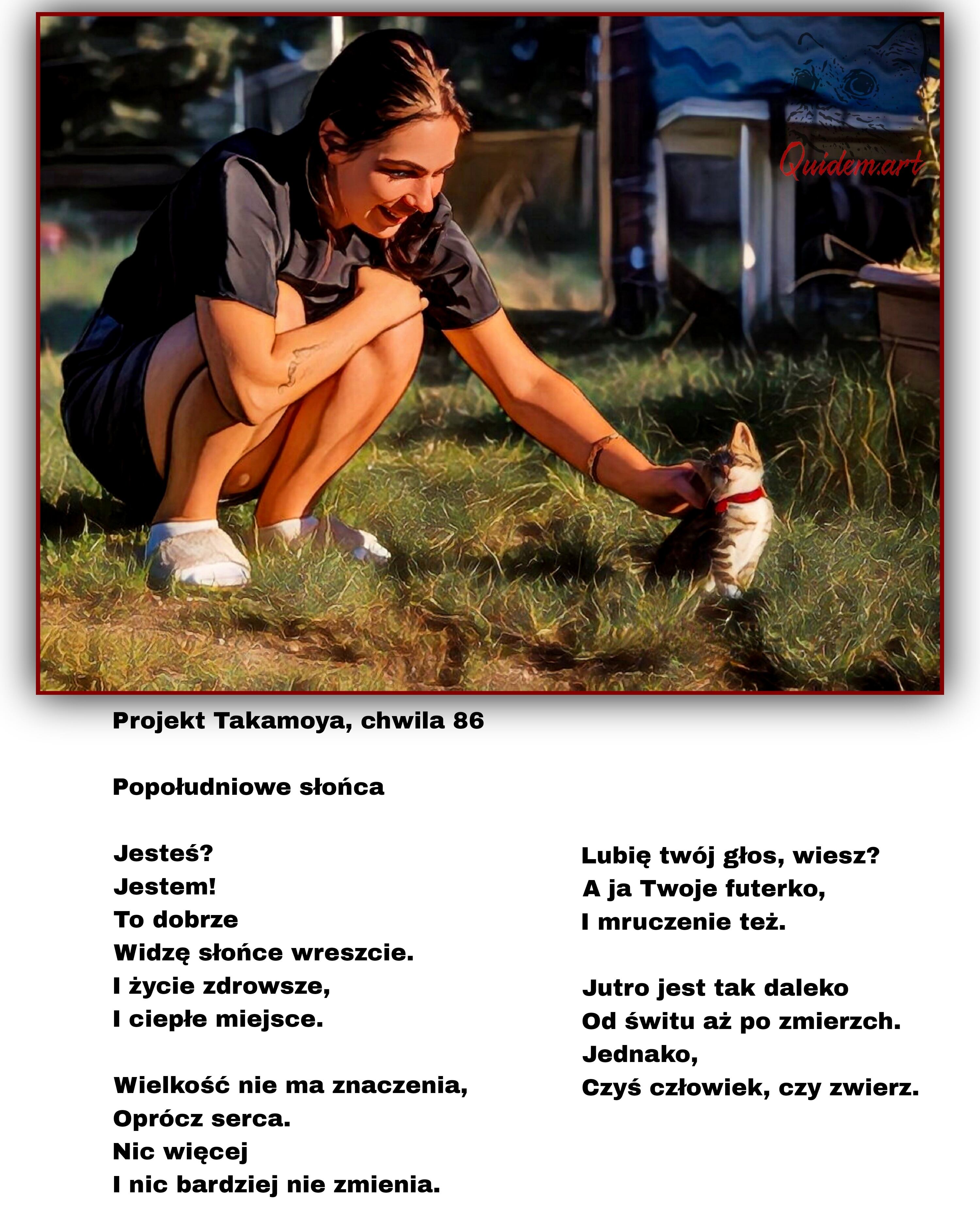 Projekt Takamoya, chwila 86 Jesteś? Jestem! To dobrze Widzę słońce wreszcie. I życie zdrowsze, I ciepłe miejsce. Wielkość nie ma znaczenia, Oprócz serca. Nic więcej I nic bardziej nie zmienia. Lubię twój głos, wiesz? A ja Twoje futerko, I mruczenie też. Jutro jest tak daleko Od świtu aż po zmierzch. Jednako, Czyś człowiek, czy zwierz.