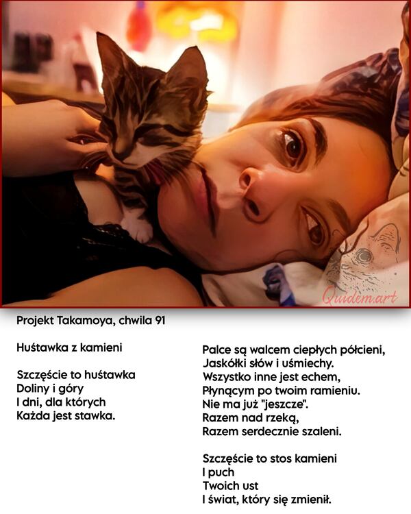 Projekt Takamoya, chwila 91 Szczęście to huśtawka Doliny i góry I dni, dla których Każda jest stawka. Palce są walcem ciepłych półcieni, Jaskółki słów i uśmiechy. Wszystko inne jest echem, Płynącym po twoim ramieniu. Nie ma już "jeszcze". Razem nad rzeką, Razem serdecznie szaleni. Szczęście to stos kamieni I puch Twoich ust, I świat, który się zmienił.