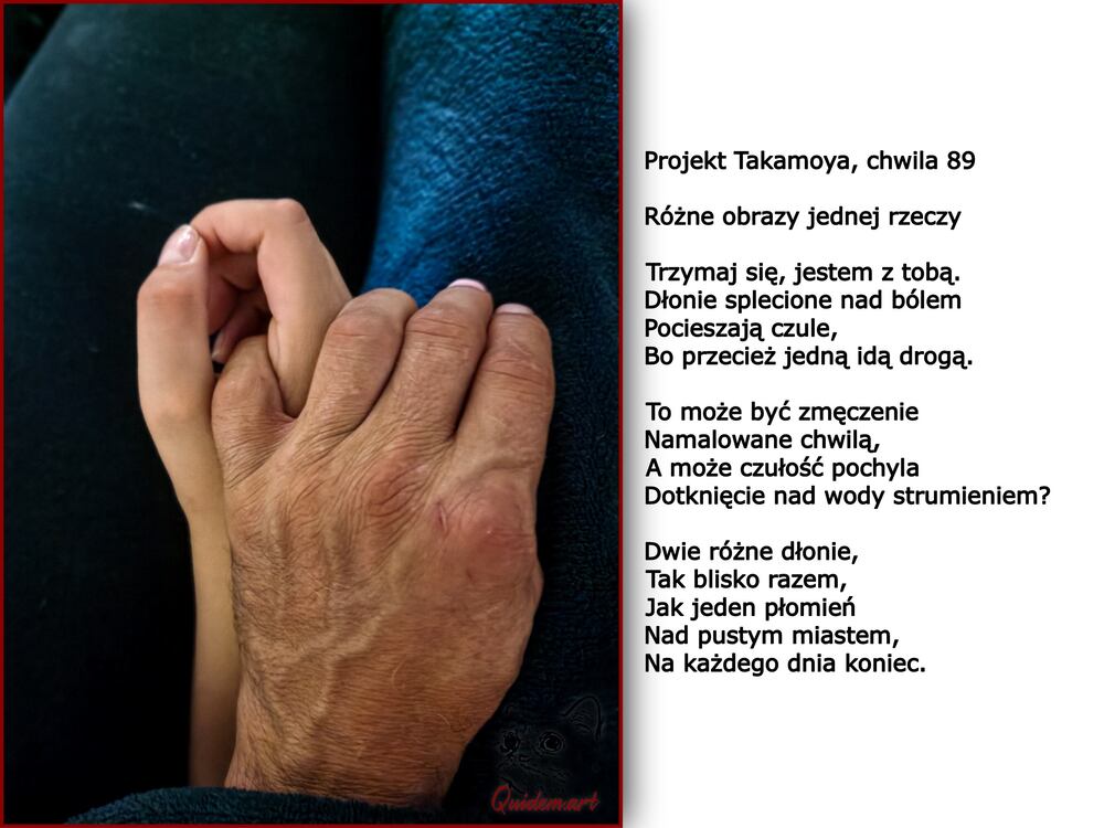 Projekt Takamoya, chwila 89 Trzymaj się, jestem z tobą. Dłonie splecione nad bólem Pocieszają czule, Bo przecież jedną idą drogą. To może być zmęczenie Namalowane chwilą, A może czułość pochyla Dotknięcie nad wody strumieniem? Dwie różne dłonie, Tak blisko razem, Jak jeden płomień Nad pustym miastem, Na każdego dnia koniec.