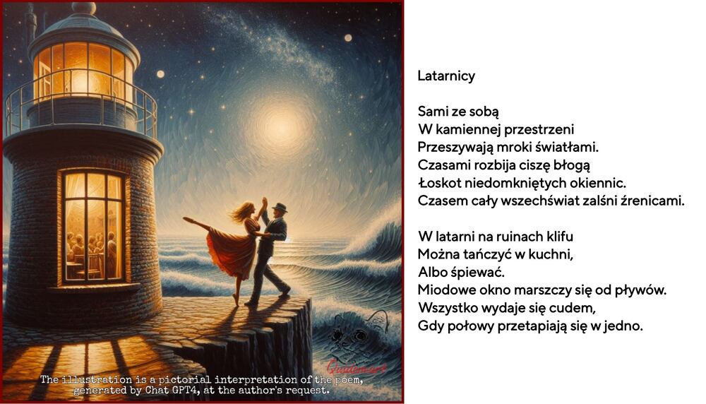 Sami ze sobą W kamiennej przestrzeni Przeszywają mroki światłami. Czasami rozbija ciszę błogą Łoskot niedomkniętych okiennic. Czasem cały wszechświat zalśni źrenicami. W latarni na ruinach klifu Można tańczyć w kuchni, Albo śpiewać. Miodowe okno marszczy się od pływów. Wszystko wydaje się cudem, Gdy połowy przetapiają się w jedno.