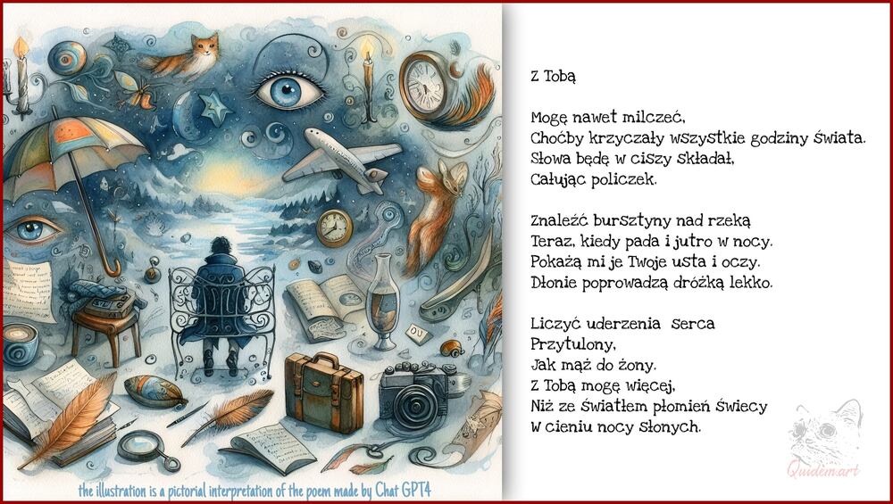 Mogę nawet milczeć, Choćby krzyczały wszystkie godziny świata. Słowa będę w ciszy składał, Całując policzek. Znaleźć bursztyny nad rzeką Teraz, kiedy pada i jutro w nocy. Pokażą mi je Twoje usta i oczy. Dłonie poprowadzą dróżką lekko. Liczyć uderzenia serca Przytulony, Jak mąż do żony. Z Tobą mogę więcej, Niż ze światłem płomień świecy W cieniu nocy słonych.