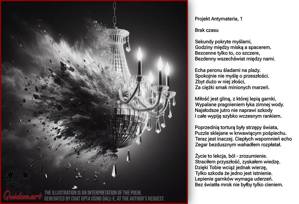 Projekt Antymateria*, 1 Sekundy pokryte myślami, Godziny między miską a spacerem. Bezcenne tylko to, co szczere, Bezdenny wszechświat między nami. Echa peronu śladami na plaży. Spokojnie nie myślę o przeszłości. Zbyt dużo w niej złości, Za ciężki smak minionych marzeń. Miłość jest gliną, z której lepią garnki, Wypalane pragnieniem łyka zimnej wody. Najsłodsze jutro nie naprawi szkody I całe wypiję szybko wczesnym rankiem. Poprzednią torturą były strzępy świata, Puzzle sklejane w krwawiącym pośpiechu. Teraz jest inaczej. Ciepłych wspomnień echo Zegar bezdusznym wahadłem rozpłatał. Życie to lekcja, ból - zrozumienie. Straciłem przyszłość, zyskałem wiedzę. Dzięki Tobie wciąż jednak wierzę, Tylko szkoda, że jedno jest istnienie. Lepienie garnków wymaga uderzeń. Bez światła mrok nie byłby tylko cieniem. (*cykl wierszy napisanych w trakcie pobytu w ZK)