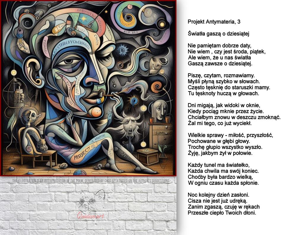 Projekt Antymateria, 3 Nie pamiętam dobrze daty, Nie wiem , czy jest środa, piątek, Ale wiem, że u nas światła Gaszą zawsze o dziesiątej. Piszę, czytam, rozmawiamy. Myśli płyną szybko w słowach. Często tęsknię do staruszki mamy. Tu tęsknoty huczą w głowach. Dni migają, jak widoki w oknie, Kiedy pociąg mknie przez życie. Chciałbym znowu w deszczu zmoknąć. Żal mi tego, co już wyciekł. Wielkie sprawy - miłość, przyszłość, Pochowane w głębi głowy. Trochę głupio wszystko wyszło. Żyję, jakbym żył w połowie. Każdy tunel ma światełko, Każda chwila ma swój koniec. Choćby była bardzo wielką, W ogniu czasu każda spłonie. Noc kolejny dzień zasłoni. Cisza nie jest już udręką. Zanim zgaszą, czuję w rękach Przeszłe ciepło Twoich dłoni.
