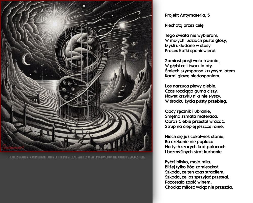 Projekt Antymateria, 5 Tego świata nie wybieram, W małych ludziach puste głosy. Myśli układane w stosy Proces Kafki sponiewierał. Zamiast pasji wola trwania, W głębi celi twarz idioty. Śmiech szympansa krzywym lotem Karmi głowę niedospaniem. Los narzuca plewy glebie, Czas rozciąga guma ciszy. Nawet krzyku nikt nie słyszy. W środku życia pusty przebieg. Obcy ręcznik i ubranie, Smętna szmata materaca. Obraz Ciebie przestał wracać. Strup na ciepłej jeszcze ranie. Niech się już cokolwiek stanie, Bo czekanie nie popłaca Na tych szarych krat pałacach I bezmyślnych strat kurhanie. Byłaś blisko, moja miła. Bliżej tylko Bóg zamieszkał. Szkoda, że ten czas straciłem, Szkoda, że los sprzyjać przestał. Pozostało zapić winem, Chociaż miłość wciąż nie przeszła.