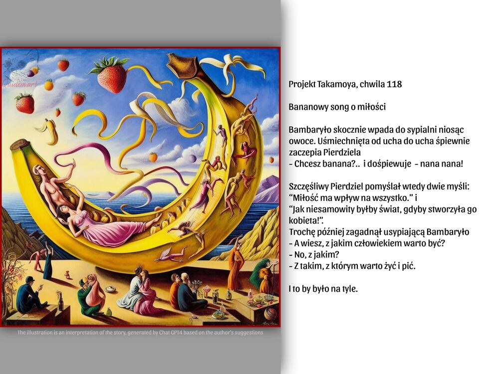 Projekt Takamoya, chwila 118 Bambaryło skocznie wpada do sypialni niosąc owoce. Uśmiechnięta od ucha do ucha śpiewnie zaczepia Pierdziela - Chcesz banana?.. i dośpiewuje - nana nana Szczęśliwy Pierdziel pomyślał wtedy dwie myśli: “Miłość ma wpływ na wszystko.” i “Jak niesamowity byłby świat, gdyby stworzyła go kobieta!”. Trochę później zagadnął usypiającą Bambaryło - A wiesz, z jakim człowiekiem warto być? - No, z jakim? - Z takim, z którym warto żyć i pić. I to by było na tyle.