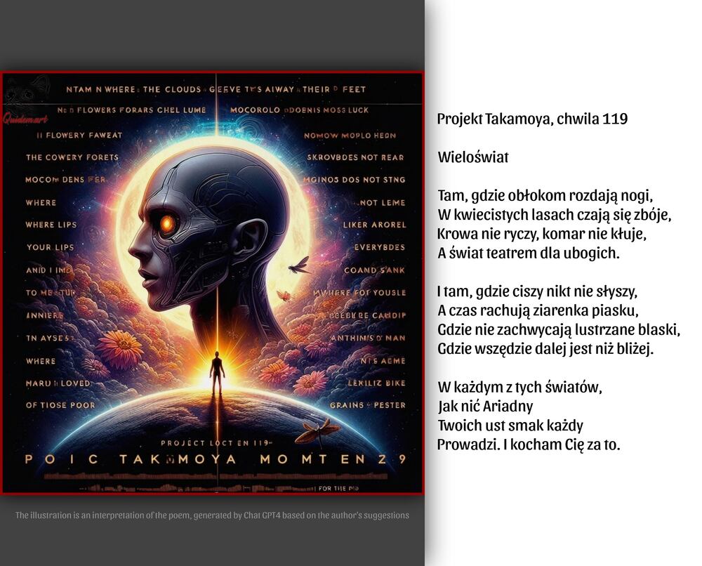 Projekt Takamoya, chwila 119 Tam, gdzie obłokom rozdają nogi, W kwiecistych lasach czają się zbóje, Krowa nie ryczy, komar nie kłuje, A świat teatrem dla ubogich. I tam, gdzie ciszy nikt nie słyszy, A czas rachują ziarenka piasku, Gdzie nie zachwycają lustrzane blaski, Gdzie wszędzie dalej jest niż bliżej. W każdym z tych światów, Jak nić Ariadny, Twoich ust smak każdy Prowadzi. I kocham Cię za to.