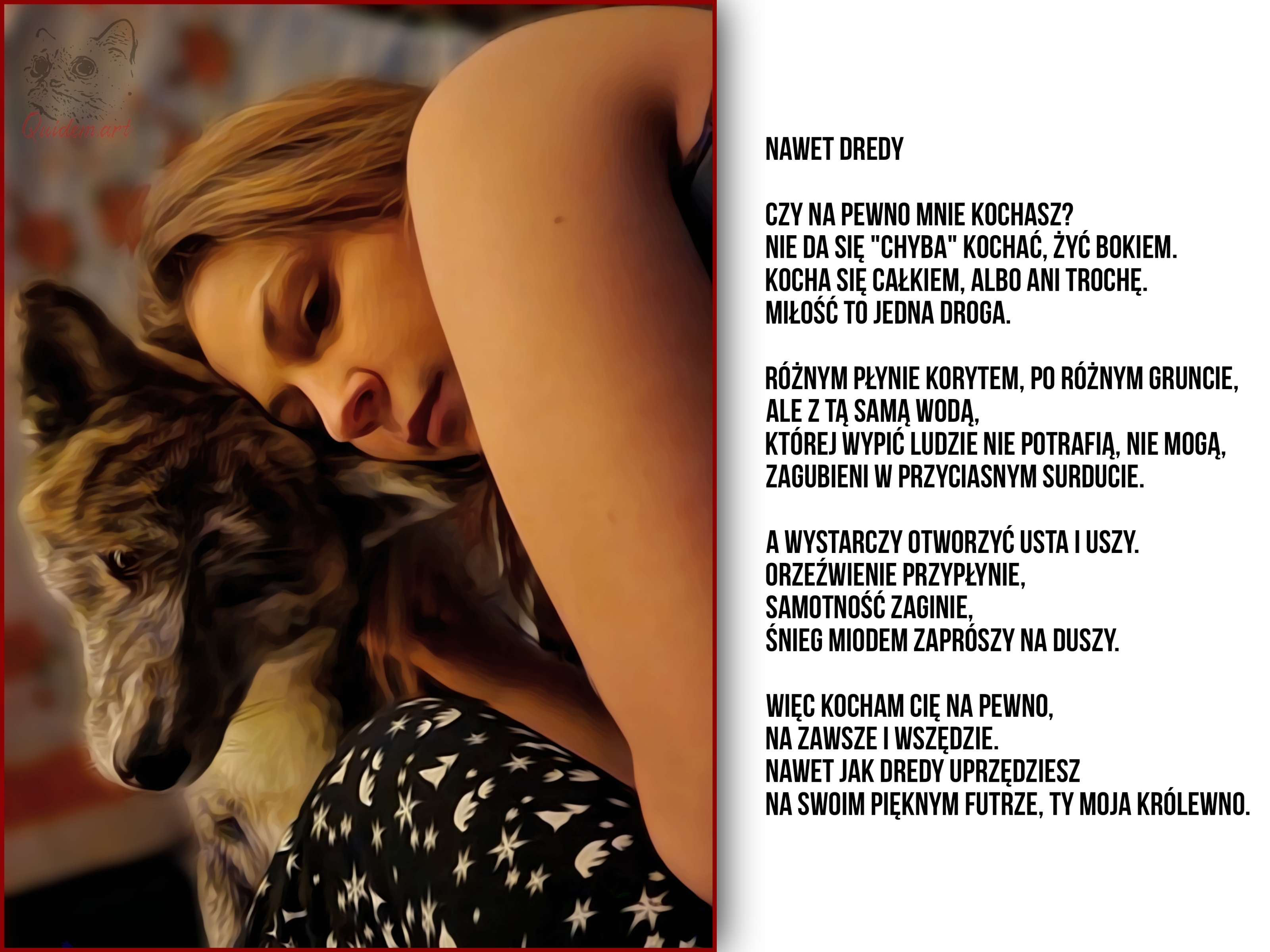 Czy na pewno mnie kochasz? Nie da się "chyba" kochać, żyć bokiem. Kocha się całkiem, albo ani trochę. Miłość to jedna droga. Różnym płynie korytem, po różnym gruncie, Ale z tą samą wodą, Której wypić ludzie nie potrafią, nie mogą, Zagubieni w przyciasnym surducie. A wystarczy otworzyć usta i uszy. Orzeźwienie przypłynie, Samotność zaginie, Śnieg miodem zaprószy na duszy. Więc kocham Cię na pewno, Na zawsze i wszędzie. Nawet jak dredy uprzędziesz Na swoim pięknym futrze, Ty moja królewno.