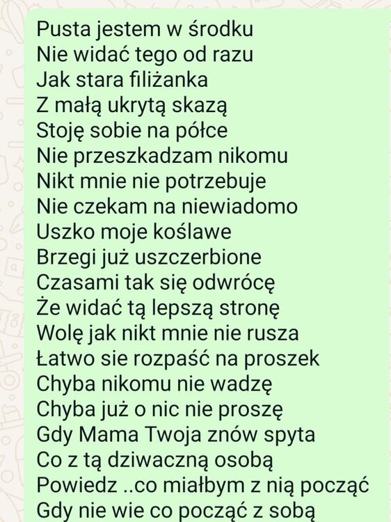 Osoba ja Osoba ja siedzi sobie obok Nie ma pewności czy miejsce chce zagrzać Czy czymś się zająć Czy patrzeć leniwie Czy być sobą Czy udawać lepszą A może gorszą Osoba bez pewności a jednak spokojna Osoba ja na pewno wie tylko Że lubi herbatę z cytryną maliną bez cukru Z niezagrzanego miejca łatwiej uciec