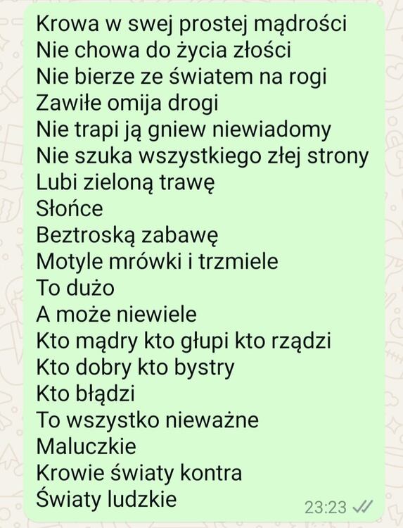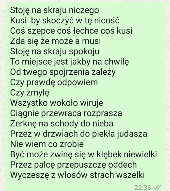 Jaki będzie dzień w którym umrę Czy będzie słońce czy chmury Co pomyślę w ostatniej chwili Przypomni się słońce czy góry Gdzie wtedy będę Kto przy mnie Może odejdę sama Czy będzie wieczór południe A może to stanie się z rana Czy będę spokojna czy może Myśl jakaś nieznośna się zdarzy Czy będę zalewać się łzami A może z uśmiechem na twarzy Poczekam sobie cierpliwie Zrobię herbatę poczytam Wiem przecież że z każdą chwilą Po kawałku już znikam