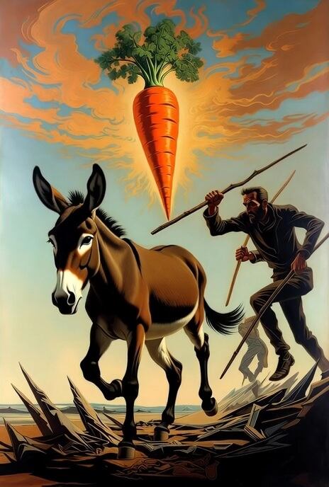 O wadze marchewki w kieracie, Nie równej dwóm kijom, rzecz czy znacie? – Był sobie gospodarz-reformator, Który zabrał marchewkę i batom Powierzył naukę swego osła. Bez nadziei marchewki poniosła Oślinę hen w dal szybka noga…– Tak skąpca reforma bywa droga. Ilustrował „Grok”, pod dyktando Marcina Tarnowskiego. -