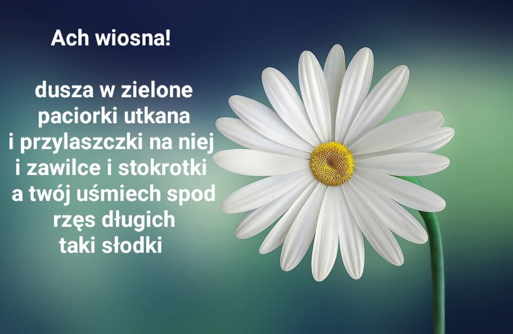 leżę na łące wiatrem przepełniona jestem jakby piórkiem co spada tuż obok i ląduje blisko granic - zmysłów moich nieopodal gdy deszcz szumi ja nadal leżę na ziemi twardej między wierszami mój uśmiech wcale nie blednie powstrzymuję swój nagły szloch wyciszam się cała słodkimi westchnieniami - ulegle i leżę na łące zaplecionej ludzkimi ustami pełna snów kolorowych w czerwonej sukience ze wstążkami jasnymi z niebem na zawsze związana biegnę przez puch gęsty w dłoniach atłasowych chowam miłości różowe okręty biegnę z oddaniem przed siebie dogania mnie wiatr niebiesko-letni a ja ubrana w sen miodowy utkany nicią złotą jakbym skrzydeł dostała - frunę wysoko ku niebiosom leżę na łące chłodnej od rosy z chmur przezroczystych subtelnych bezruchem spadają jaskrawe krople a ja wciąż jestem bezcennie uparta ręką perłową trawę łaskoczę dosięgam stopą puszystej mety wtapiam się w pejzaż pragnieniem rozdęty