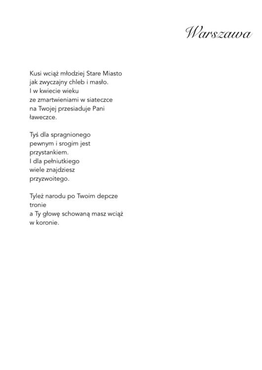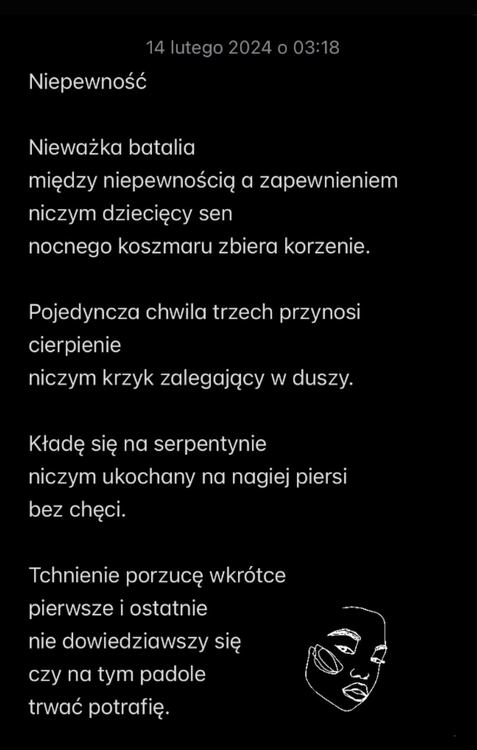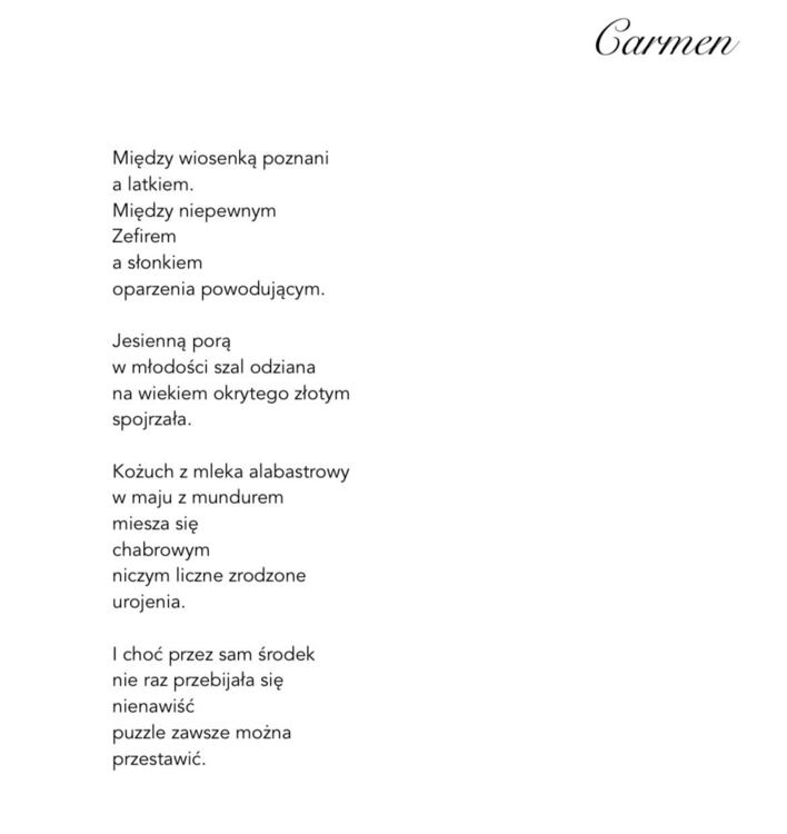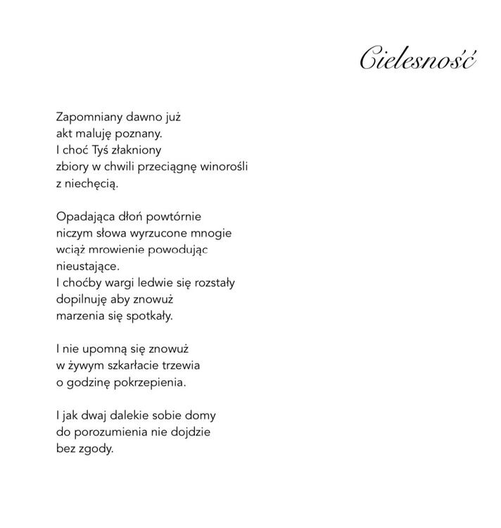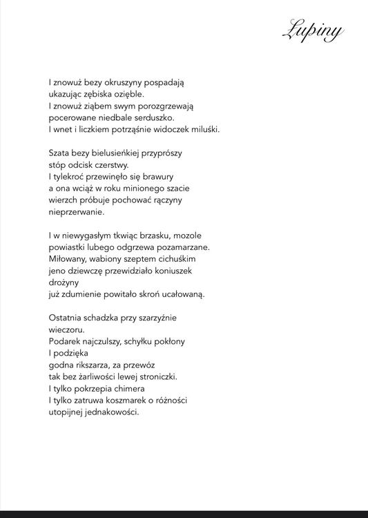 Mój tomik dostępny na empik.com w wersji ebook. Zapraszam <3 https://www.empik.com/aura-laura-kalinska-siadul,p1396607620,ebooki-i-mp3-p?fromSearchQuery=laura+kalińska+siadul+ Obnaż igiełki bialuchne, bądź ukochana mawiała matula od świtu do świtu. Niechże bawi, jeśli wola szkarłatu oczętom przyoszczędź w podzięce. Sukienczyna grabiami poskramiana kapelusina z nikłej skroni się rzuca rąsię działaniem splamione w rękawicach pochowane. I do melodyjki ukołysane nóżyny dziewczę wystygłe posyła pokłony. Jutrzenka podwoje światełkiem rozchyliła I do wnętrza sprosiła. A my jak łazęgi, zbłąkane sieroty chwil niezdrowych, zszarzałych. Laleczka prawicę dobrodzieja całuskiem osypuje zaciska piąstkę, ząbki, usteczka. W rytm apelu mateczki i pana załamana swą dolą nózia pląsa zmizerniała. Ze słodyczą na języku za dań podziękowała.