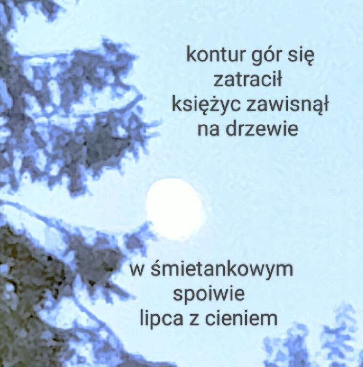 aha ;-) że natchnione za bardzo? no może ciut, dlatego jest też wersja bardziej relaksacyjna: Krety miniatura 2025-07-08 23:48 Kontur gór się stracił, księżyc zawisnął na drzewie w śmietankowym spoiwie lipca z cieniem. https://www.twojewiersze.pl/pl/wiersz,MzFeN201MzIyMCYxZjFhMHI0KzM Wszystkiego dobrego :-) PS. Ksiądz Popiełuszko zginął męczeńską, tragiczna śmiercią To były czasy, gdy ginęło się za prawdę. Jakie są teraz ani jakie będą, nie mogę przecież wiedzieć. Najlepiej po prostu by było nic nie pisać, to zawsze najbezpieczniejsze,