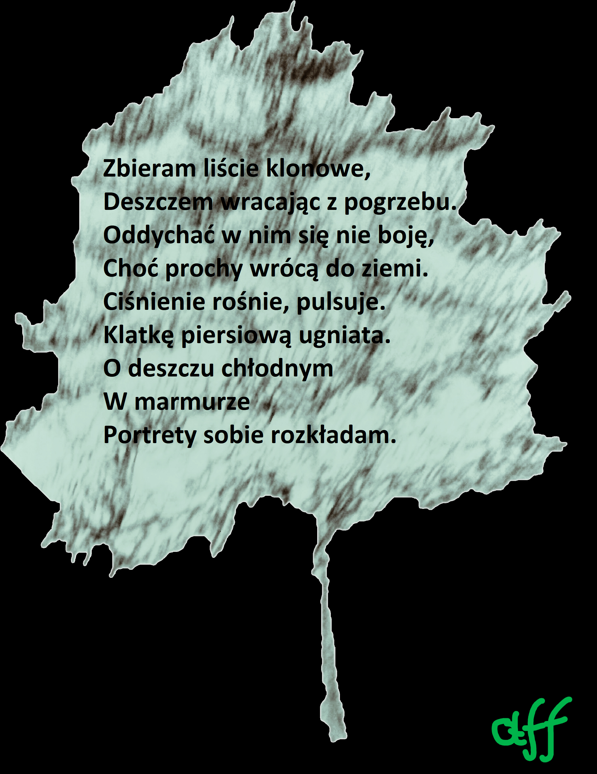 Zbieram liście klonowe, deszczem wracając z pogrzebu. Oddychać w nim się nie boję, choć prochy wrócą do ziemi. Ciśnienie rośnie, pulsuje. klatkę piersiową ugniata. O deszczu chłodnym W marmurze portrety sobie rozkładam.