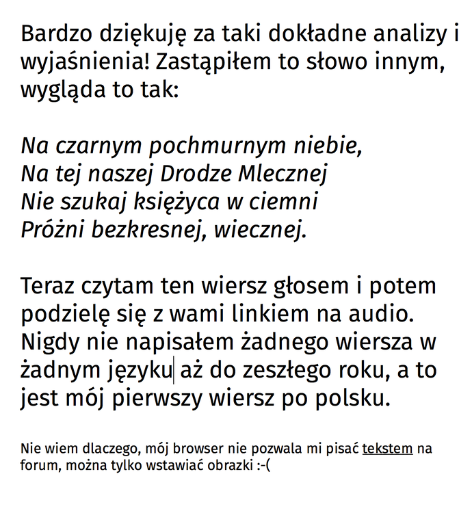 1. ▶︎ Tekstem: https://kobzar.be/blog/poem-pl-01/ ▶︎ Głosem: link na YouTube Pod koniec wideo wspomniałem o Polskim Portalu Literackim Dziękuję @Agfka, @Violetta, @Somalija, @Poezja.Tancy za uznanie, za krytykę i cenne rady! Wziąłem pod uwagę wszystkie wasze rady. Po pracy nad wierszem chciałem poprawić swój polski, który nie jest moim językiem ojczystym: więcej w nim czytać i, kto wie, może znów coś w nim napisać. Z waszą pomocą :-) André Kobzar, Żenewa🇨🇭