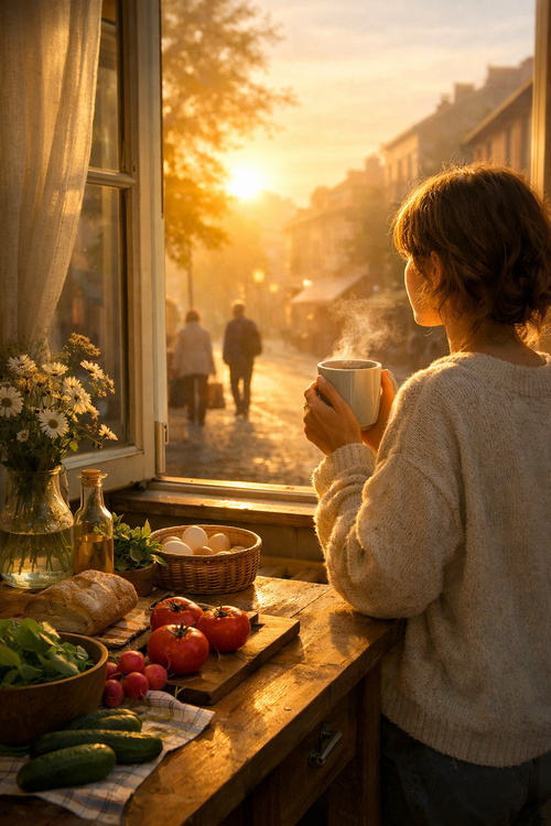 „Poranek” Chwila gdy światło rozjaśnia powieki, cisza splata się z zapachem kawy. Za oknem miękko budzi się dzień, a słońce osiada na twarzach przechodniów. Stoły pachną świeżością warzyw, dom oddycha spokojem poranka. Ktoś stoi w oknie, obejmuje kubek ciepłego naparu, jakby trzymał w dłoniach ciszę. Taki obraz dojrzewa w myślach, czy to tylko wyobraźnia? Czy wystarczy chwila, by stał się rzeczywistością?