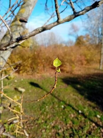Kilka dni temu na spacerze robiłam jesienne zdjęcia, i zaskoczyło mnie to, że pomimo późnej pory roku natura potrafi zaskoczyć wiosenną witalnością. Drzewa już nagie, ogołocone ostatnimi wichurami, a tu - maleńki zielony listek, który jeszcze chce żyć. Wiosna jesienią - Tie-break/listopad 2025 -