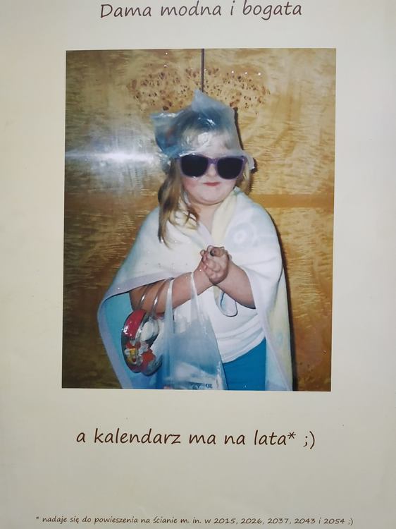 Luzik - co parę lat kalendarz się powtarza i można użyć tego samego. Kiedyś mojej Wtedyjeszczenieżonie zrobiłem kalendarz ze zdjęciami z dzieciństwa - brzmi banalnie, ale... no sama popatrz: ;) Pozdrawiam. PS. Kurde szok, właśnie do mnie dotarło, że użyłem czcionki jan komułzykanta zanim stało się to modne (wybaczcie, ktokolwiek to czyta - Janko w szczególności - ale nie mogłem się powstrzymać przed doedytowaniem). ;)