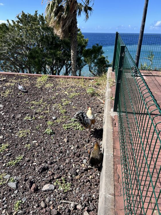 Dwie kurki na wolności w kurorcie :) chyba uciekły i zaznajomiła się z gołębiami:) ostatni sok z mango i kawa mocna. A woda zmienia tylko kolor :) Pięknie mi ptaszki śpiewają:) bo morze ciche:) I złote motyle fruwają:) taki ciepły żółty, nie cytrusowy:)