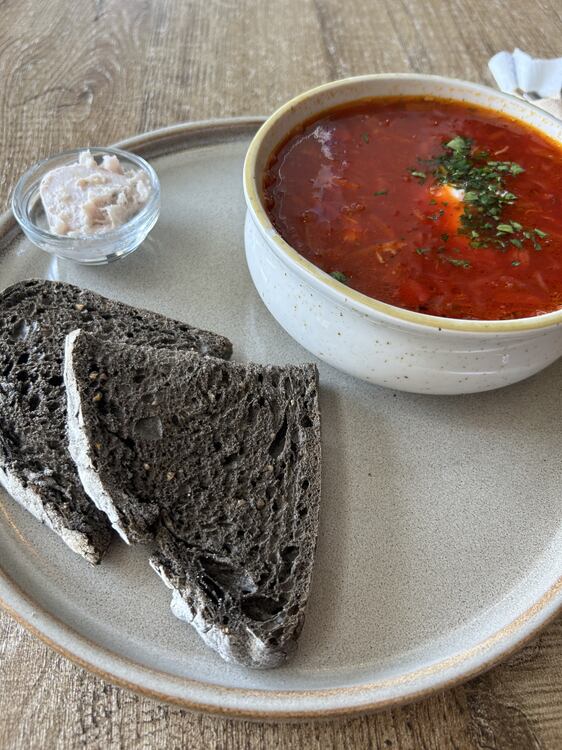Barszcz ukraiński w wersji portugalskiej, bo z żółtych kurczaków ze smalcem polskim w lekkiej wersji, chlebek pyszny, ciepły i chrupiący:)