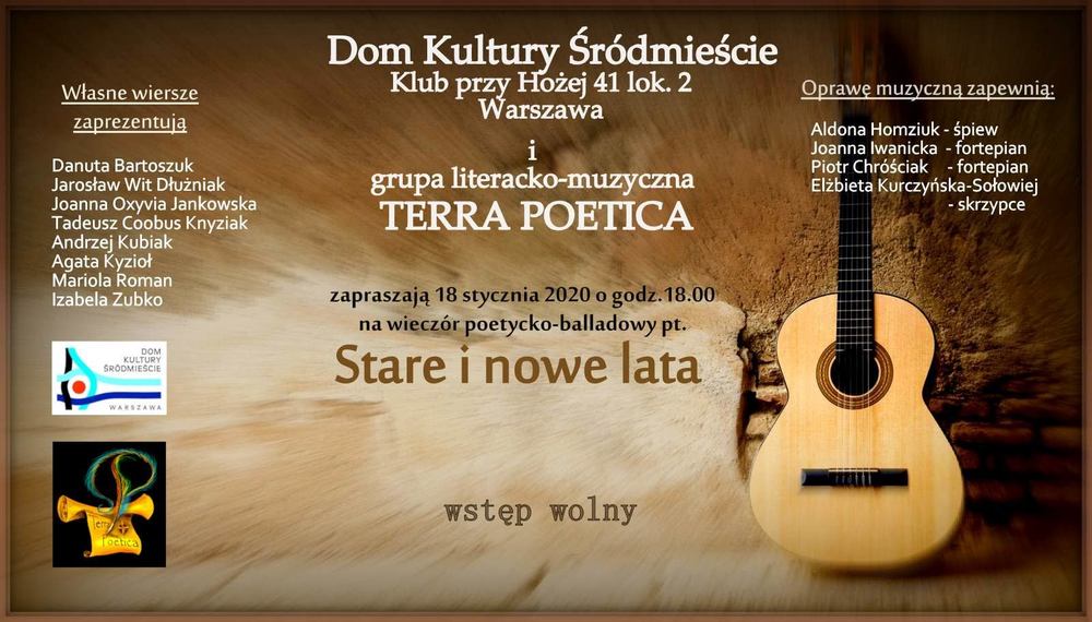 Sie zaprasza wszystkich w dniu 18 stycznia do Śródmiejskiego Domu Kultury przy ul. Hożej 41, na godz. 18.00, na kolejny już wieczór literacko-muzyczny grupy Terra Poetica. W programie autorskie wiersze wykonawców oraz piosenki z muzyką Joanny Iwanickiej i z tekstami terran. Gwoździem programu będzie pojawienie się na deskach scenicznych Kota Szaroburego, po ponad rocznej nieobecności. Wstęp wolny. Obecność nieobowiązkowa