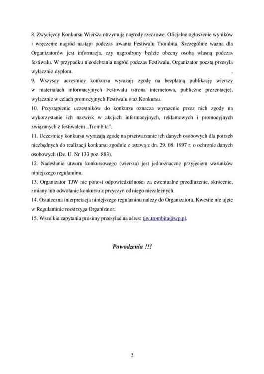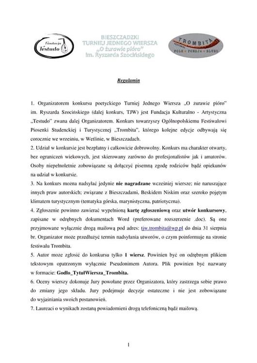 Zapraszamy do konkursu poetyckiego. Termin zgłoszeń przedłużony do 08 września br. Karty w załączniku. "Turniej Jednego Wiersza im. R. Szocińskiego" (śp. poety bieszczadzkiego) towarzyszy jak co roku, organizowanemu przez naszą Fundację Kulturalno-Artystyczną Testudo "Ogólnopolskiemu Festiwalowi Piosenki Studenckiej i Turystycznej Trombita ".