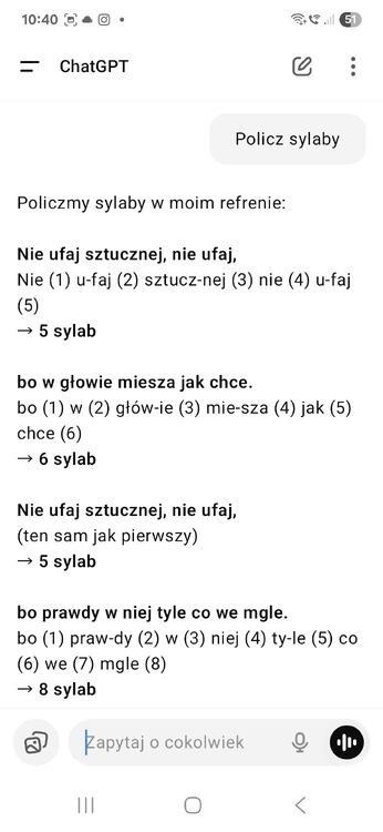 18. Nie ufaj sztucznej, nie ufaj, bo może ci szepnąć do ucha głupoty nie słuchaj stek bzur stek bzur za wzór Sztucznej nie ufaj, bo skoro wie wszystko najlepiej i wiedzę od ludzi telepie na wiór na wiór za wzór Widzę że liczyć nie umie sylaby jej giną w tłumie to pomoc poetom na ...uj na ..uj za wzór PS pobawiłam się nieco, wrzucając swoje teksty do oceny AI. Trochę zaskoczeń, trochę inspiracji. Garść refleksji i czerwone światło dla tych co nie lubią myśleć. @beta_b
