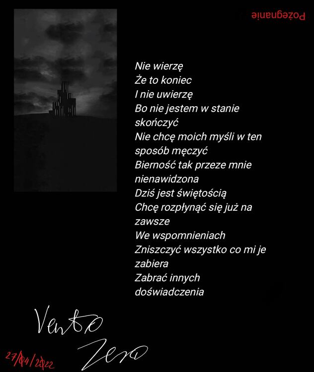 raz po raz smagana wiatrem, miesza ciepło łez z chłodem deszczowych kropel, wzbiera w niej niewysłowiona gorycz, a kres sił kształtuje jej niemy wyraz, otworzywszy swe oczy, błądzi po podniebnym bezkresie swej udręki, na wskroś przeszyta chłodnym pomrukiem burzy, łka, brodząc kolanami we łzawym marzeniu. gwałtowną myślą sięga do swego wnętrza, jak gdyby szukała nienazwanego źródła wszystkiego, co teraz pomimo jej krzyków i płaczu, bezlitośnie odziera ją z naiwnego snu, zostawiając jedynie z tlącym się w sercu wspomnieniem twej bliskości i bolesną ułudą tego czym niegdyś dla niej była.