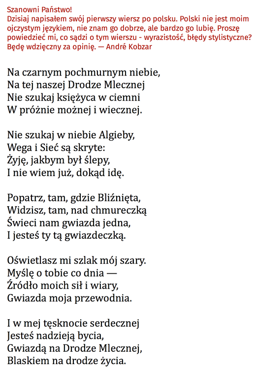 ▶︎ Tekstem: https://kobzar.be/blog/poem-pl-01/ ▶︎ Głosem: link na YouTube Pod koniec wideo wspomniałem o Polskim Portalu Literackim Dziękuję @Agfka, @Violetta, @Somalija, @Poezja.Tancy za uznanie, za krytykę i cenne rady! Wziąłem pod uwagę wszystkie wasze rady. Po pracy nad wierszem chciałem poprawić swój polski, który nie jest moim językiem ojczystym: więcej w nim czytać i, kto wie, może znów coś w nim napisać. Z waszą pomocą :-) André Kobzar, Żenewa🇨🇭 -