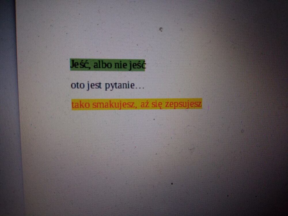 Kuj je emocje z pieczarkami, Niczym pierogi ze skwarkami, Mieszają się wyzwolone, z racjonalnymi - myślami! Ależ, czy trzeba zachować szyk? Czyż trzeba robić taki, porządek? By z myśli śpiewnych tworzyć chór, jakoby rządek? A może jednak da się zjednać dwutakt? Niczym wyzwolenia z racjonalizmem, pakt? Zdołam się szukać takiego pretekstu. To wszystko zależy - od kontekstu!