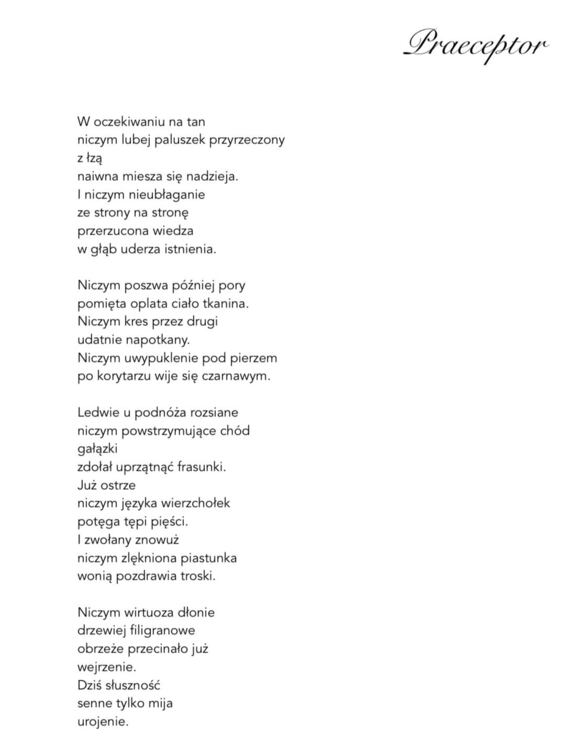 Nie powtarzaj mnie w pamieci, jak obrzydły wierszyk, nudny. Już się z tobą nie rymuję, jestem szczera, ty obłudny. Nie patrz na mnie jak w gazetę, której treści są ci męką. Już od dawna nic nie mówię, a tyś moją jest udręką. Nie myśl o mnie jak o kurtce, co przed wieki się znudziła. Tyle ciepła dać bym chciała ale jestem ci niemiła. Nie mów o mnie jak o meczu, co przegrany, nic nie warty. Przecież jestem wyższa liga chociaż ty rozdajesz karty. I nie wracaj mi do serca, nie ma doń już drogi, przejścia. Wszystkie ścieżki zaorałeś tym, że kochać mnie przesłaleś.