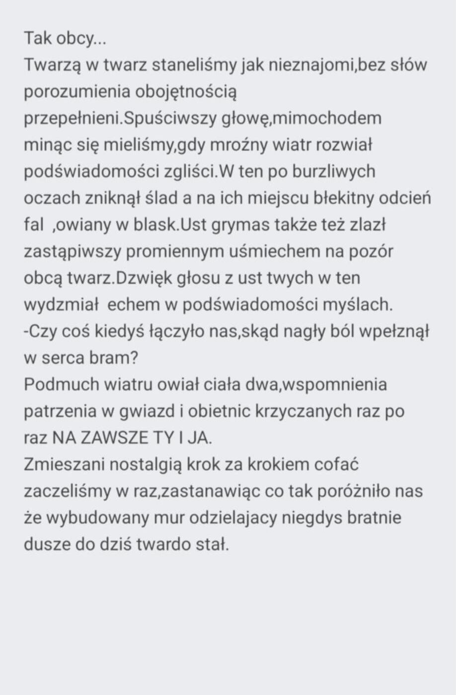 dedykuję Natalii Kruk Cóż z tego, że się zmierzcha. Ciepłem kominek przyciąga, nieme futryny szarością zgasiły ogień pożądań. Zegar dźwięki przywołał, melodii z dzieciństwa znanej, w półmroku ugrzęzły słowa, wchłonęły milczące ściany. Płomień rozedrgał przestrzeń w dotyku kochanych dłoni. Zaś usta spijają resztki przeszłości w kolorze soli. A filiżanki stygną - samotne w zapachu kawy. Świadome - że wszystko mija czas grzebie okruchy marzeń. Cóż z tego, że się zmierzcha, gdy wokół tyle się dzieje. Wsiąknie w poduszkę łezka, nadzieje wrócą, gdy dnieje.