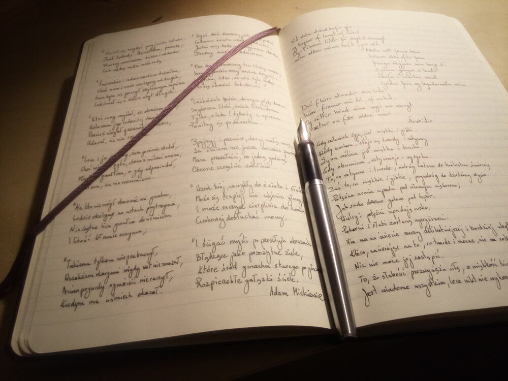 Mam czarny zeszyt w skórzanej oprawie. Chowam w nim wiersze, piosenki i myśli, Audycje, sceny, co tylko się przyśni, W nadziei, że gdzieś go komuś zostawię. Oddać rękopis, to jak oddać duszę. Każdą literę kreśląc wiecznym piórem Zna się na wylot papieru fakturę, Kształt, kolor, zapach i garby wybrzuszeń. Lecz trzymać słowo bezczynnie na półce, Tego poeta wytrzymać nie zdoła. Słowo żyć musi i krążyć dokoła, Wpadać do głowy jak jaja kukułce. Więc rozstaniemy się kiedyś z zeszytem, Nic nie trwa wiecznie na świecie niestety. Ale niech jeszcze szeleszczą wersety, Słów barwne wstęgi mym pismem podszyte.