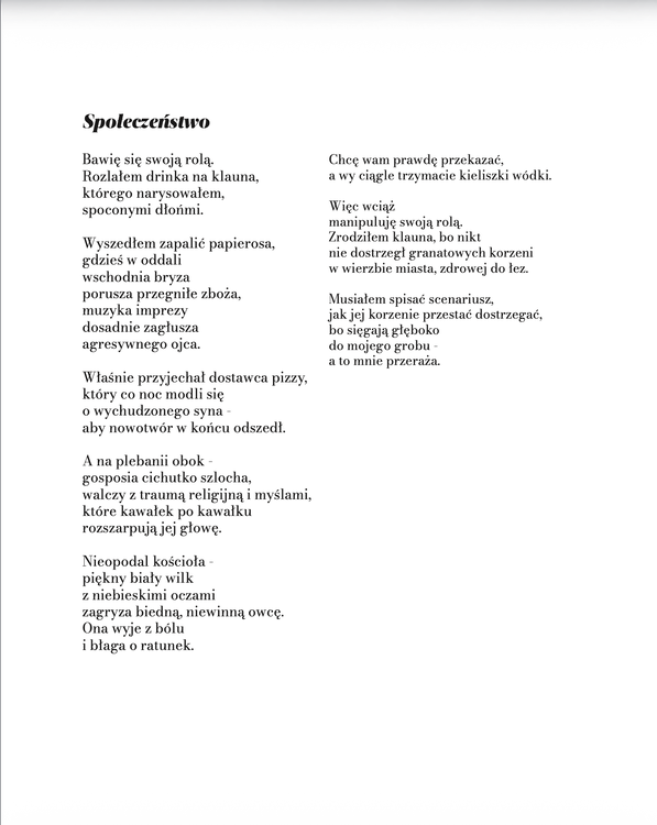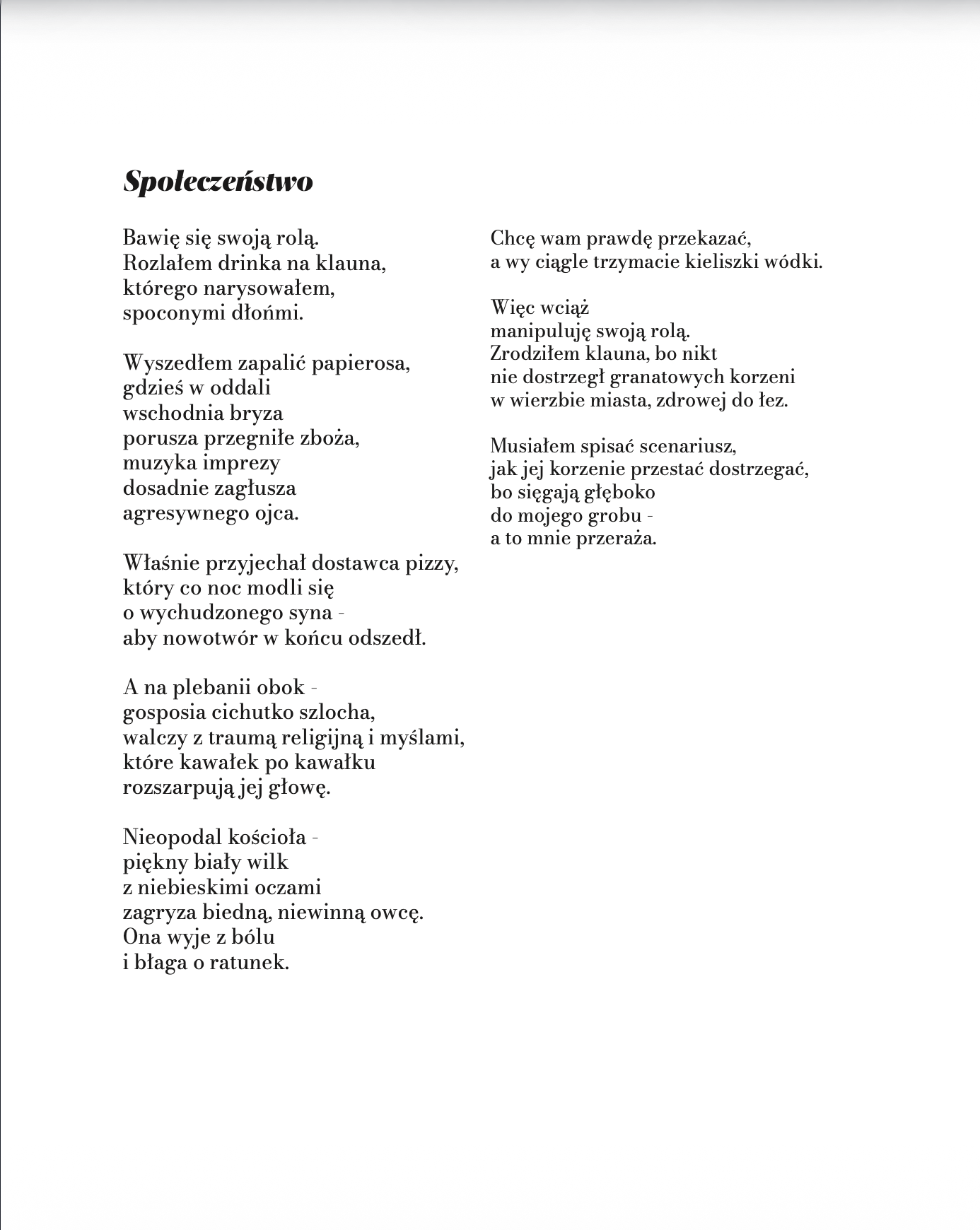 Gdzie jest twój Bóg?! Leżysz teraz na kracie ogień spala twoje ciało wierny i oddany za chwilę trup, chciałbyś... ale jeszcze poczekaj śmierć byłaby łaską ale jej nie otrzymasz jęcz, a smród palonego ciała wypełni powietrze poczekaj, nie umieraj prosisz Boga o śmierć – o nie, nie tak szybko Zadajesz sobie pytania? Jeszcze chwilę – otwórz oczy nie, no ty się modlisz?! Nie masz już ciała, zdychasz ale nikt cię nie dobija może myślisz, że kogoś uratowałeś zginą w męczarniach, a może szybciej oni dostaną ten przywilej leżysz na kracie, wiem jak ciało zamienia się w węgiel jak szpila ognia wchodzi w skórę wiem, kiedy się krztusisz i wiem, kiedy myśli wyciekają z bólu a ty się k… ciągle modlisz?! Dziś wawrzynem wędzę swoje papryki są naprawdę niezłe ...