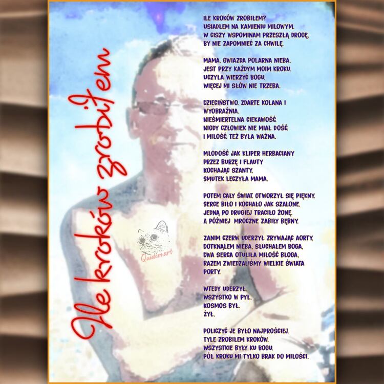 Ile kroków zrobiłem? Usiadłem na kamieniu milowym. W ciszy wspominam przeszłą drogę, By nie zapomnieć za chwilę. Mama. Gwiazda Polarna nieba. Jest przy każdym moim kroku. Uczyła wierzyć Bogu. Więcej mi słów nie trzeba. Dzieciństwo. Zdarte kolana i wyobraźnia. Nieśmiertelna ciekawość. Nigdy człowiek nie miał dość. I miłość. Też była ważna. Młodość jak kliper herbaciany Przez burze i flauty Kochając szanty. Smutek leczyła mama. Potem cały świat. Otworzył się piękny. Serce biło i kochało jak szalone. Jedną po drugiej traciło żonę. A później mroczne zabiły bębny. Zanim czerw uderzył zrywając aorty, Dotknąłem nieba, słuchałem Boga, Dwa serca otuliła miłość błoga, Razem zwiedzaliśmy wielkie świata porty. Wtedy uderzył. Wszystko w pył. Kosmos był. Żył. Policzyć je było najprościej. Tyle zrobiłem kroków. Wszystkie były ku Bogu. Pół kroku mi tylko brak do miłości.