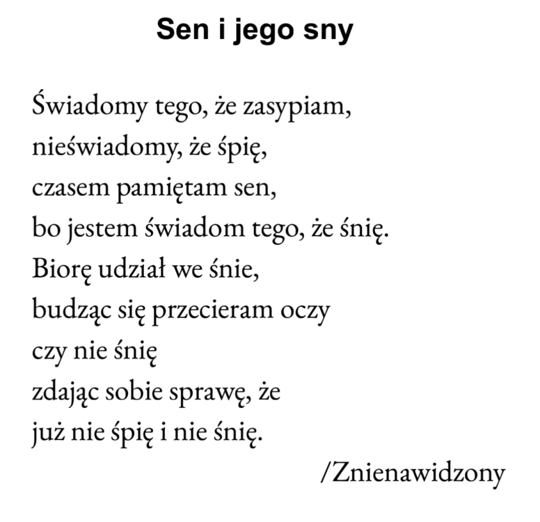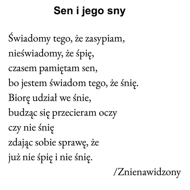 Kontekst Tracę wątek szybciej, niż kończę początek Kątem oka widzę zatarty kontekst Wolę Boga przyjmuję bez pieczątek na dokumentach, jednak wolę Boga, który oszczędza wrzątek: jak wola jest letnia, to ja jestem święta, wśród łąk wrażeń i zrażeń, się parzę jak mięta Nie pokażę wam marzeń gdyż mi nikt nie rozkaże, a nienawidzę nakazów; ten inicjatywy mnie nęka Niby człowiek jest żywy, póki jego ręka nie zatonie w betonie i się stanie cmentarzem w cementach, zgubionym w nie swoim planie, na polanie nikłego piękna, a zaczęty wątek stanie się stosem szczątek Więc jaki był kontekst?