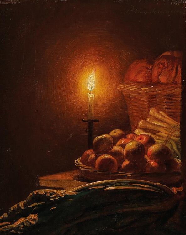 Zamknąłem oczy pod okiem pełni – Wilk zawył życzenie? Niech się spełni! „Las” dziewanny wzniosłych łodyg morze Ma stopa i ręka czy wpław zmoże? Powinny, bo puszcza! za plecami. Blisko-daleko samotnia mami Kolor jej szary „lan” z metalu Spokój, gdy jak przy pręgierzu, palu. Pukam, Drzwi się niechętnie otworzą Zewnątrz dzień, wewnątrz „noc” – oczy korzą Się przed straszną czułą ciemnością. Wchodzę myśląc czyją jest własnością? Właściciel młody z wieków bagażem; Wbrew, ku niemu a on taki władczy – Znać arogant, a łagodnie patrzy. U stóp kobierzec łaskaw mi wskaże Klęknę a on tłumaczy i każe…, A wszystko to zdadzą się głupoty, Co mimo, zdadzą mi się to psoty. Musiał zoczyć niewyraźną minę, Bo spojrzał tak, że poczułem: ginę. „Jam u władz, – co chciałbym w klauzulach!” I targając mi włos na łbie rozczula. „Radzić, prognozować się zdarzało… Słuchałbyś? Spełnić by ci się dało?” Kojon patrzę w prawdziwą świecę, Pomarańcz na stole, w sen śniąc lecę. Jasno. Czyż rano? Pusto. Wychodzę, Za drzwiami na przekór przez noc brodzę, – Była pełnia. Zaszła? Tylko gwiazda, Choć jasna, – planeta? Jowisz? Wilkom Może latarnia, – macając przez las, Jakiż wonny. Pod stopą konar trzasł I prysnął jak od różdżki śniony świat. Znów zasnę? Wstanę, łazienka, prysznic – Pod wodą mrzonką sen moment się śni… Znów myśl gna mi w Twą zwykłą stronę… Na próżno?! – Czyż nie wszystko skończone? Ilustracja: Petrus van Schendel (1806–1870) „Stilleben mit Äpfeln und Kerze” („Martwa natura z jabłkami i świecą”), przed 1870.