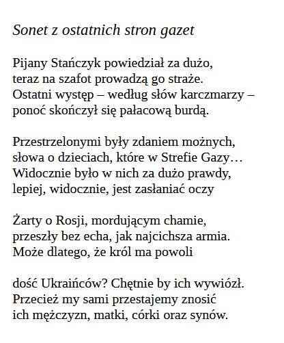 Poranieni Ofiarom wojny, która się nie odbyła. Przekonano mnie, że jestem ofiarą. Od dziś to część mnie, jak oko czy ręka. Czuwa nade mną w stu kolorach wstęga, otwiera rany zajadły megafon. Bez przekonania, lecz z myślą o skarbach, wlokę za tłumem swoje wiotkie członki — ponoć skostnieją i sam krzycząc: Chodźmy! będę prowadził, głosząc czym jest prawda. Jedno spokoju mi tylko nie daje — ja to ofiara, ale kim są inni? Musi oprawców być to bura zgraja, bo szli by z nami, będąc niewinnymi. My — starym ludem, który z kolan wstaje, by w bruk na nowo przypierdolić nimi.