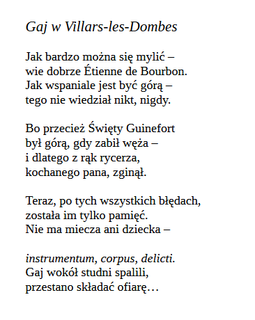 Na krakowskim Wawelu o północy spotkałem grupę głośnych lunatyków stali w okręgu kreśląc dłońmi wzory jakby nawdychali się białego pyłu Wzniosłymi słowami gnębili ciszę która uniżyła się pod bełkotem żującym wypowiedzi lichy wątek w swojej szczęce od czasu zgniłej W imię czego spajacie się w obręcz? Proszę spojrzeć na smoka wawelskiego jak pręży łuski przed pana wzrokiem Lecz tu wyłącznie blady obłok się tli szyjący obietnice z szarej mgły Więc udowodnij nam że to obłęd