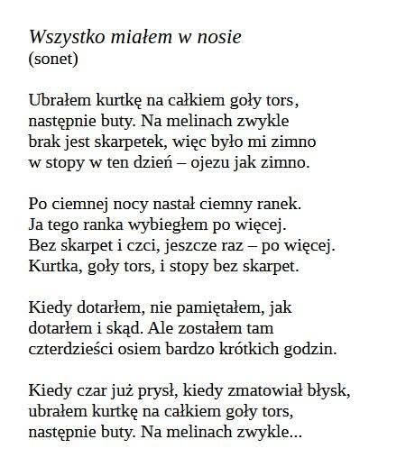 Między godnością Wyższość w nieboskłon dmie deszcz czarodziejski. Deszcz żywi kwiaty, kwiat karmi magiczne oko, które jest tak daleko w tyle, serce, które wyższość chce sercem obdzielić. Widzę jak koty leniwie się budzą. Czuję jak wilgoć stuka w suche nozdrza. Szukam w kłębach chmur niebyłego ojca — może go znajdę? Może mi się uda? O, Panie Boże, czy nie jest za późno, byś mnie wychował w tym wiejskim kościele? Chyba te chmury nie drobią na próżno kropel tak czystych, niczym łzy anielskie? Może poczekam, aż ich ciałka sfruną? Byś odpowiedzi w ten sposób udzielił.