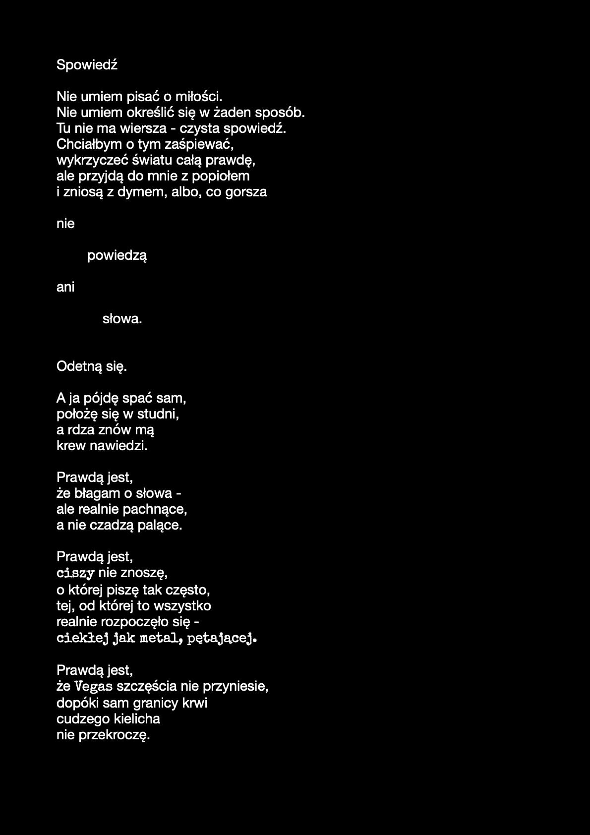 Drogi Pamiętniku, czy przyniesiesz mi ukojenie? Pragnę zacząć, by nie kończyć. Zaczynam pisać, by nerwy uwolnić. Tkwię w tym szaleństwie. Kocham. Cierpię. Próbuję zrozumieć bezkres, przytłaczający stres. Gdy zniknę — oznajmię ci: to był mój grzech. Ten ciągły lęk. Owszem, wiem, że masz żal. Ale podsumuj swój wszelaki wkład. Którą z moich wad karmiłeś? Te wszystkie lata... Szukanie rozwiązań? A dziś stawiasz mnie nagiego, bez szacunku, w złym świetle wizerunku. Źle mi patrzeć w lustro. Kiedyś widziałem w sobie bóstwo. Czas zmienił me odbicie w oszustwo. Nienawidzę siebie. Skłonny jestem do szaleństwa. Uwagę przyciąga bestia. Mroczna agresja. Ciągnie mnie w dół, tam, gdzie presja ma głos. Coś się kończy. Coś rodzi na nowo. Przepraszam. Zawsze byłem sobą. "Nieświt"