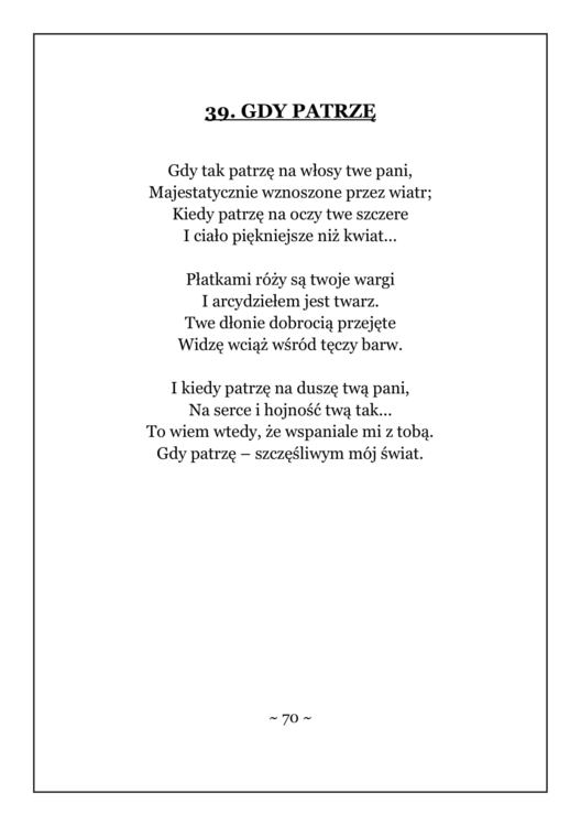 Przytulasz spojrzeniami, czuję się kochana. W cieple twego wzroku serce mi szybciej bije. Karmiona słowami pełnymi czułości, rosnę do samego nieba. Tam spijam wodę życia z chmur, a z mlecznej drogi zbieram wspólne marzenia. By poczuć szczęście, niczego więcej nie trzeba:)