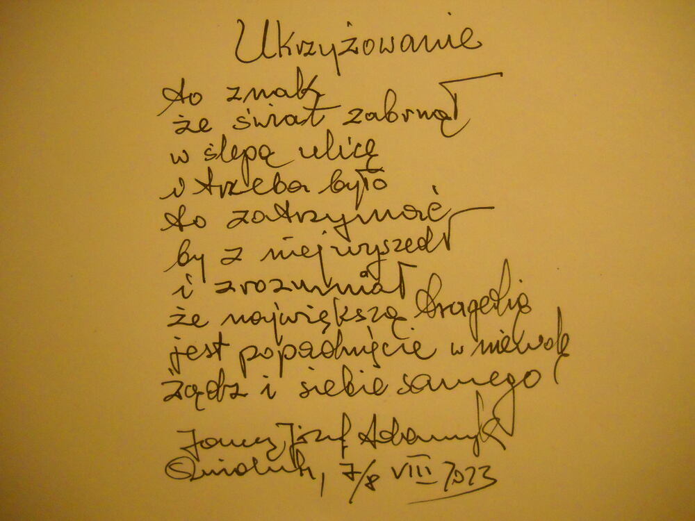 Link do mojego bloga literackiego: https://kubajozwicki.blogspot.com/search/label/Przygody walecznych psów Link do mojego kanału na YouTube: https://www.youtube.com/@CavesCrystals Miniatura, bo jednoaktówka. Apokalipsa SCENA I (Na polanie.) (Jan Spokój, obserwator nieba, diabeł) Jan Spokój (Do siebie.) Czuję – powietrze się zmienia. Podłoga grzać się zaczyna. Ach! Już nic nie ma znaczenia! Smutny, kto rządy poczyna. Drzewa na wiór wysychają, Więdną kwiaty, trawa gnije; Wszystko, wszyscy umierają! Ziemia… – Ziemia już nie żyje! (Przychodzi obserwator nieba.) O, witaj! Wiesz, co się dzieje?! Obserwator nieba Tak. Wiatr mocny właśnie wieje, Co przed godziną spostrzegłem! Zatem raz w niebo spojrzałem Przez mą, specjalną lunetę. Czy wiesz, co wtedy ujrzałem?! Lecą na naszą planetę Kamienie, chociaż niewielkie, Lecz czytałem książki wszelkie… (Po chwili.) Ty poległeś, ja poległem! Pyłek mały, w ogniu cały Zniszczy kiedyś tę planetę! Zobaczyłem tenże mały Pyłek przez moją lunetę… I ten pyłek rozpoznałem! Ach! Jakież ja plany miałem! (Upada na ziemię i zaczyna głośno, gorzko rozpaczać.) Nie myślmy już o wygodzie!... Biedny człowieczy narodzie! Jan Spokój Apokalipsa nadchodzi!!! Nie do wiary, lecz… nadciąga! (Z podziemi wychodzi diabeł.) Diabeł Niech tak będzie, samoluby! Pragnęliśmy waszej zguby! Jan Spokój Jeszcze z podziemi wychodzi… Wąż! Niech ktoś go tam więc wciąga!... Z powrotem! Ja też się lękam, Bowiem w przeszłości grzeszyłem! Trzy razy dziecko obiłem! (Rzuca się na kolana, wpada w gorzką rozpacz.) Boże, teraz… Teraz klękam! Przebacz mi, przebacz… O, Boże! Czy cierpiętnik skończyć może Razem z czartem w jego domu?! (Po przerwie.) Komu pomóc mi?! Ach, komu?! (Rozpacza jeszcze głośniej.) Diabeł Wyście mózgów swych jeńcami! On was samych nienawidzi, Zatem koniec! Koniec z wami! Każdy z was nic już nie widzi! (Wraca do podziemi; dziura w ziemi zasypuje się.) SCENA II (Na polanie; pięćdziesiąt minut później.) (Jan Spokój, obserwator nieba, lekarz, chirurg, mózg obserwatora nieba, mózg Jana Spokoju) Obserwator nieba (Wstaje; z trudem powstrzymuje łzy.) Patrzę ja przez swą lunetę… Pyłek zaraz tutaj spadnie! – Pogrzebie naszą planetę! Boję się, że skończę na dnie! Jan Spokój Też go widzę, gdyż uderza! Już ze skorupą się zderza! Popatrz! Substancja czerwona Kopułę tutaj stworzyła. Obserwator nieba Więc już nas wszystkich zabiła! Cała Ziemia jest zniszczona! Nie widać nieba nad nami, W które to całymi dniami Patrzyłem, bo to ma praca. Ach! Wysoka była płaca, Wszakże teraz… Co mi z tego?! Strasznie grzeszyłem! DLACZEGO?!!!!! Człeka prawie ja… zabiłem!!! Samego siebie zniszczyłem!!!!! (Po sekundzie.) Tedy nic mi nie zostało I nic chyba mieć nie będę, Nawet, gdy włóczni dobędę I… Cóż to się ze mną stało?! (Nadchodzą lekarz i chirurg.) Lekarz Mózg twój kłóci się z twą duszą, Przez co członki twe się kruszą I nie widzisz, czym jest życie! Obserwator nieba Dla mnie gnicie!... Dla mnie gnicie! Lekarz Prędzej bez mózgu byś przeżył Niźli zeń chmurek być dotknął! On znów chce, byś ty się potknął, Abyś kogoś też uderzył! Słyszę ja jego wołanie, Lecz chirurg go wydostanie! Obserwator nieba On już przybyć tu nie zdąży! Lekarz Przecież wokół ciebie krąży! Potrafi wszystko otworzyć, A potem – z powrotem złożyć. Chirurg Dam ci teraz znieczulenie I dla wygody – uśpienie. A!... I wszystko ci odkażę! Mózgowi twemu pokażę! (Operuje.) (Po operacji.) Chirurg Teraz jeszcze li Jan Spokój… Na świecie mógłby być pokój! (Operuje.) (Po operacji.) Mózg Jana Spokoju Ty zły…, okrutny człowieku! Mózg Obserwatora nieba My jesteśmy szatanami, A ty pragniesz walczyć z nami! Zginiesz, mimo swego wieku! Apokalipsa nadeszła, Zaś twa radość… nie, nie przeszła! (Mózgi przybierają postaci szatanów, czyli swoje prawdziwe i uciekają w głąb Ziemi.) Chirurg I jak się teraz czujecie? Jan Spokój Lepiej niźli w lipcu, w lecie! Obserwator nieba Czuję – płacze moja dusza! Jan Spokój Moja wciąż się trzęsie, wzrusza! Razem: Jan Spokój i Obserwator nieba Dziękujemy, dobry panie. Obserwator nieba …A okropność wnet się stanie! Czerwień w lawę się zamienia. Sięgnijmy więc po wspomnienia, Bo już na nas, tu – opada. Ból chwilowy zaraz zada, A każde stworzenie – zginie… Ziemia? Może tylko zgnije? Niech Bóg grzechy nam przebaczy I otrze łzy po rozpaczy. Bardzo nam, Boże, zależy. Niech każdy w ciebie uwierzy! (Lawa opada na ziemię; wszyscy umierają.)